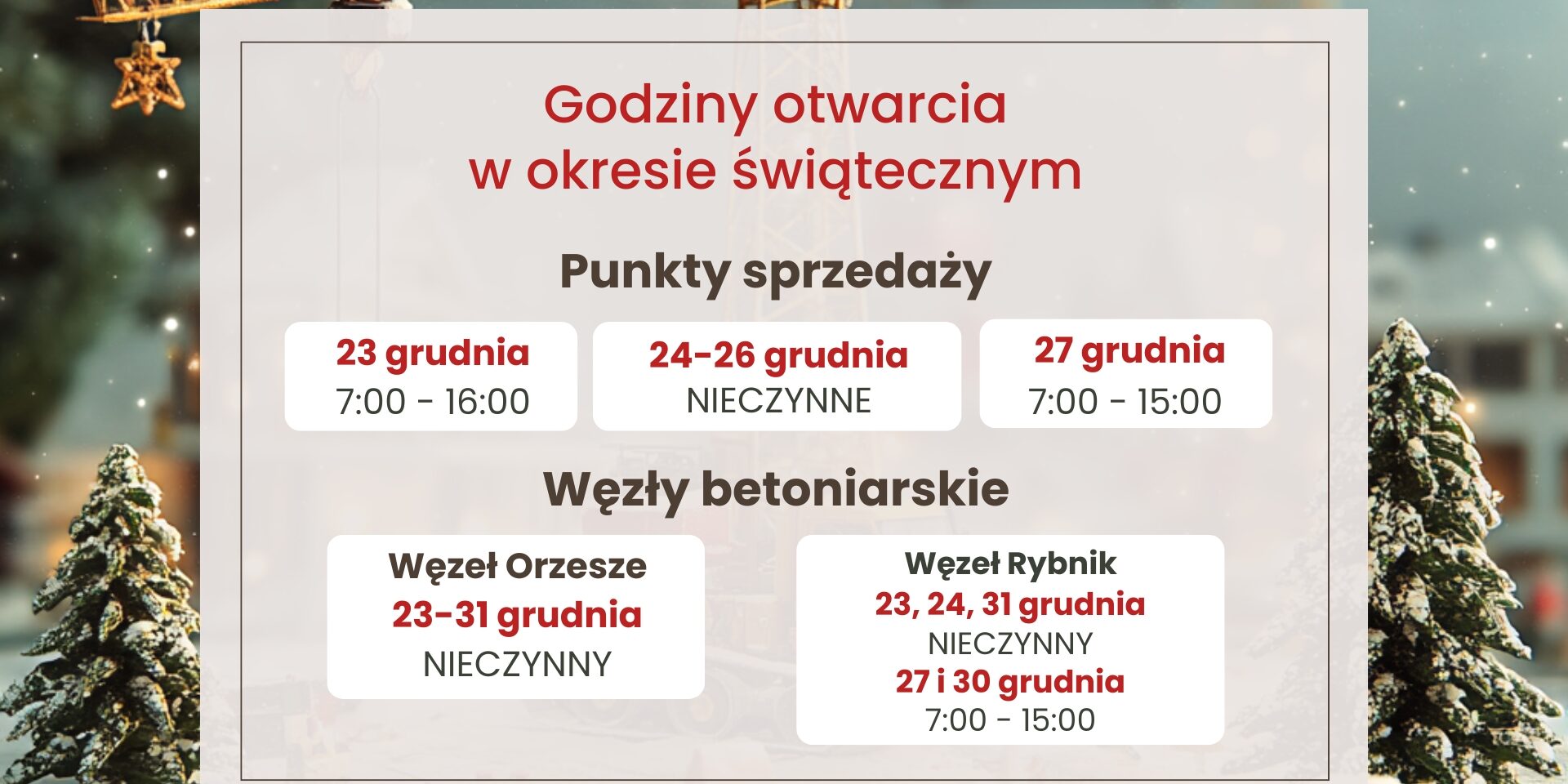 gru202024Aktualności W ten świąteczny czas 🎄 pracujemy w niestandardowych godzinach. Prosimy o zapoznanie się z grafiką. Kategoria: AktualnościBy admin385220 grudnia, 2024 Podziel się tym postem Share on FacebookShare on Facebook Share on WhatsAppShare on WhatsApp Share on LinkedInShare on LinkedIn Share on XShare on X Pin itShare on Pinterest Post navigationPoprzedniPrevious post:OGŁOSZENIE O ZWOŁANIU NADZWYCZAJNEGO WALNEGO ZGROMADZENIA AKCJONARIUSZYNastępnyNext post:INWENTARYZACJAPowiązane postyInformacja o godzinach otwarcia w okresie noworocznym29 grudnia, 2025Spokojnych Świąt i trafnych decyzji w nadchodzącym roku🎄22 grudnia, 2025Darmowa dostawa styropianu Oxiliat – oszczędzasz czas i pieniądze8 sierpnia, 2025Praca Magazynier Rybnik21 maja, 2025Specjalista ds. sprzedaży – REKRUTACJA ZAKOŃCZONA21 maja, 2025Pracownik ds. obsługi Allegro – REKRUTACJA ZAKOŃCZONA12 maja, 2025