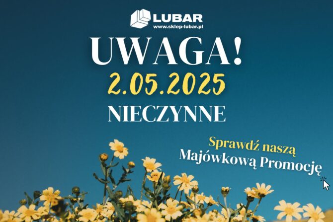 Drodzy Klienci, w dniu 2.05.2025 r. nasze punkty sprzedaży będą zamknięte.   Życzymy miłej majówki!    Sprawdźcie także naszą najnowszą promocję 👉 https://sklep-lubar.pl/majowka-,l1254,pl.html