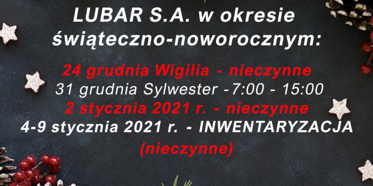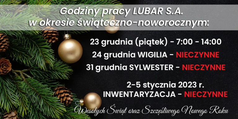 Uwaga! Informujemy, że w najbliższą sobotę, tj. 31.10 firma LUBAR jak i wszystkie oddziały…