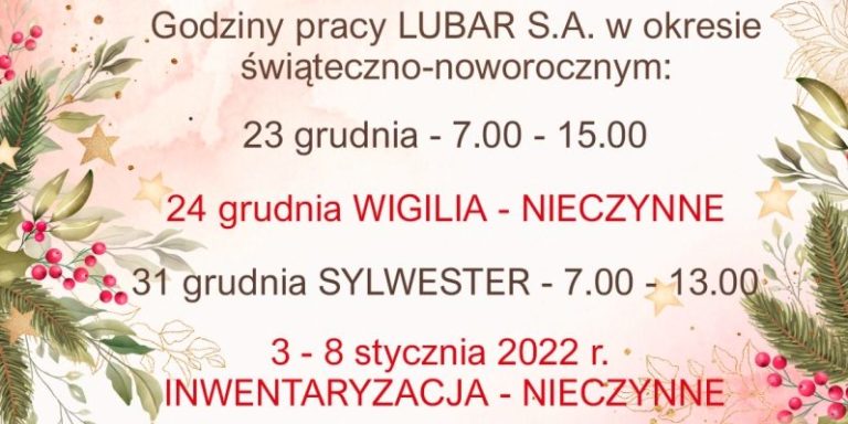 W okresie świąteczno-noworocznym pracujemy: 24 grudnia Wigilia – nieczynne 31 grudnia…