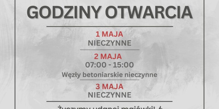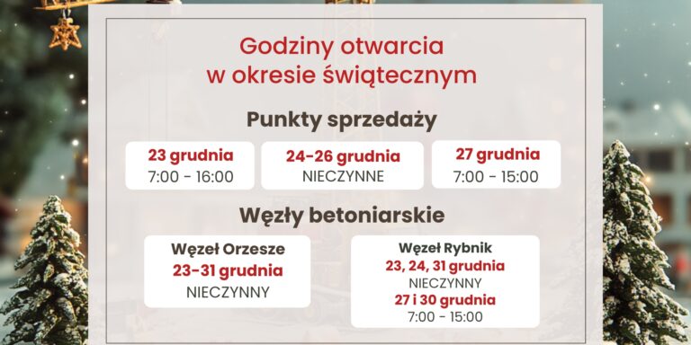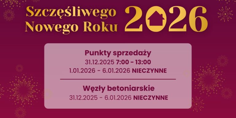 Informujemy, że w dniu 23.12 (czwartek) nasze węzły betoniarskie w Rybniku oraz Orzeszu będą…